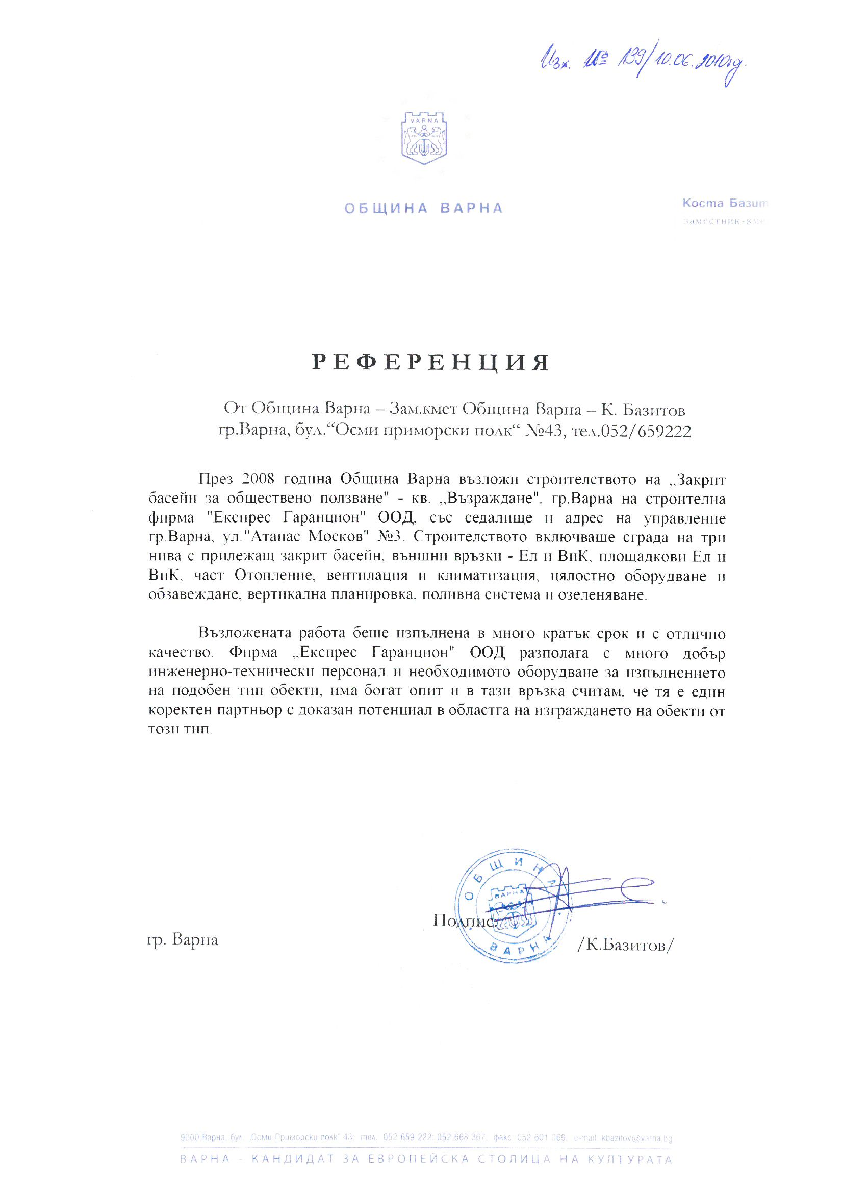 Проектиране, изграждане, обзавеждане и въвеждане в експлоатация по одобрени проекти на обществен басейн, ж. к. "Възраждане", гр. Варна – 2010 г.